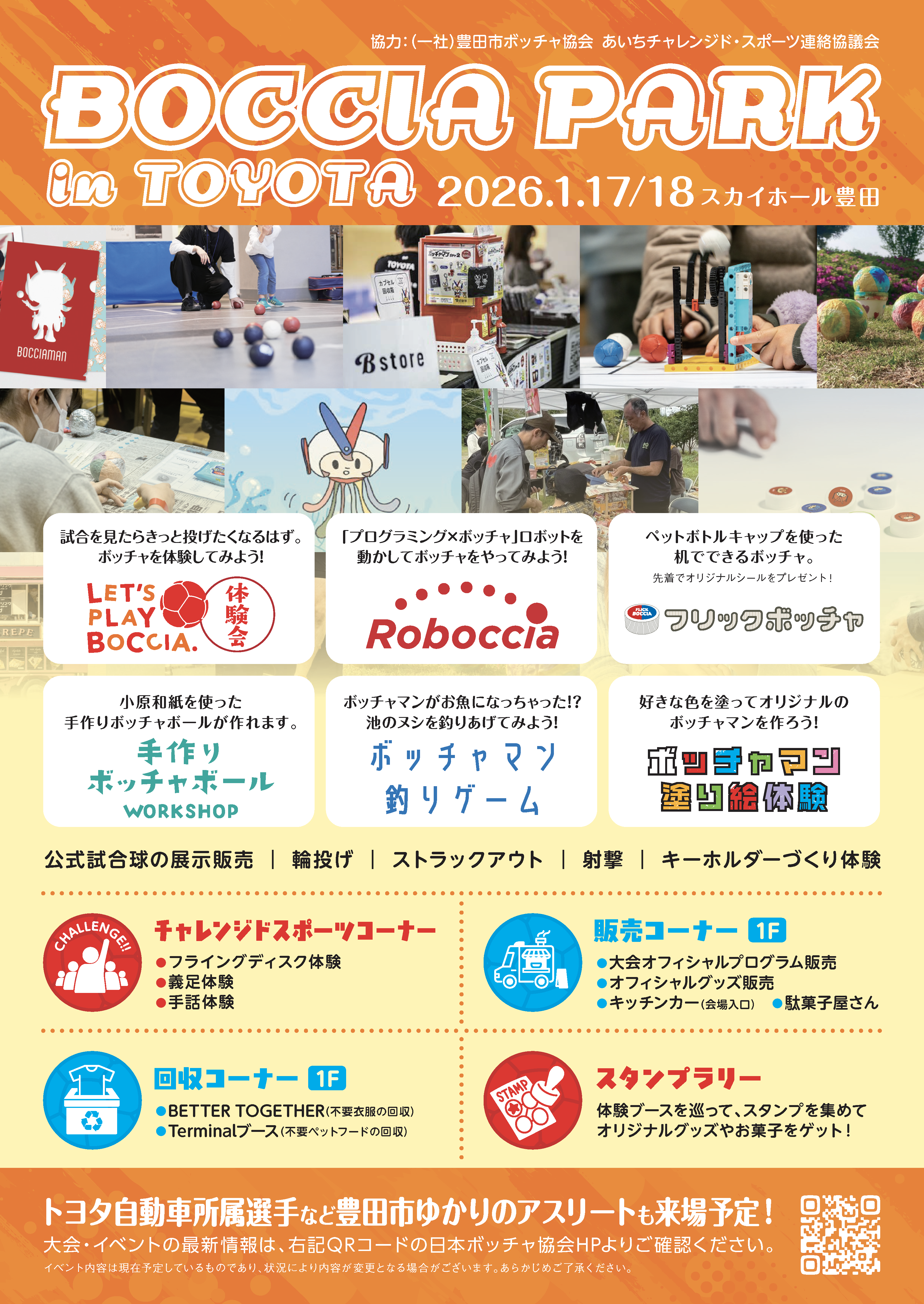 日本のトップ選手たちが集う本大会が開催される1/17(土)、18(日)には、会場となるスカイホール豊田内(主にサブホール)にて『BOCCIA PARK in TOYOTA』を併催します。選手たちの真剣勝負と共に、お子様連れでも1日楽しむことが出来る様々なスポーツ体験やアクティビティをご用意しています!