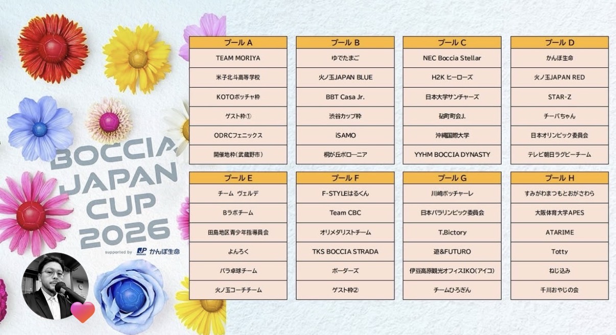 老若男女、障がいの有無に関係なく、どなたでも参加することができるインクルーシブ大会として実施されているBOCCIA JAPAN CUPは、前身のボッチャ東京カップとして2017年からスタートし、今大会で9回目を迎えます。予選会の参加チーム数、レベルも向上している大会には、予選会で出場権を獲得したチーム、ゲストチーム、ワイルドカードチームに火ノ玉JAPANチームを加えた計48チーム(予定)が出場。日本一を目指して真剣勝負を行います。本日、予選リーグ全試合の対戦表が公開されましたのでお知らせ致します。