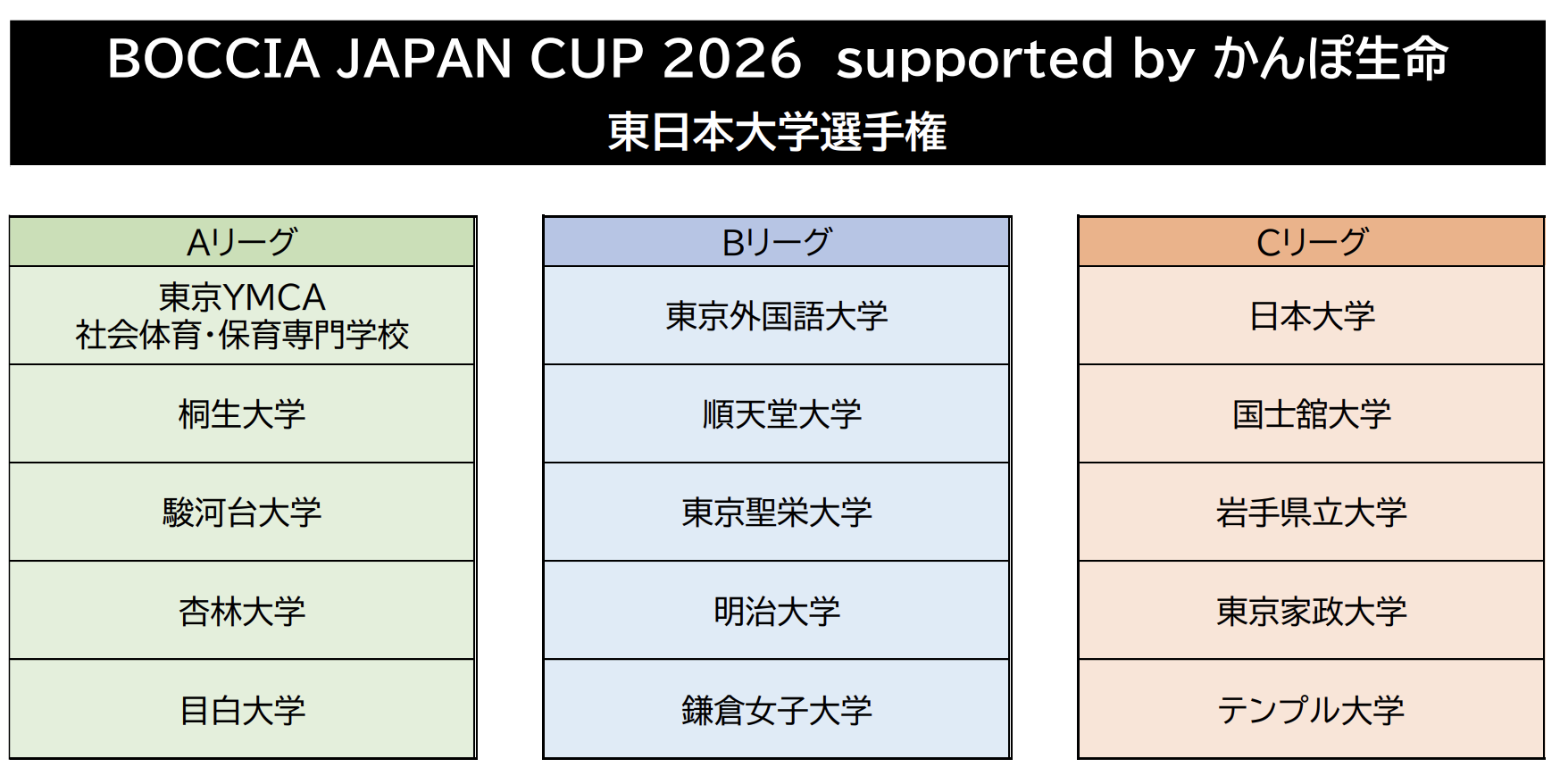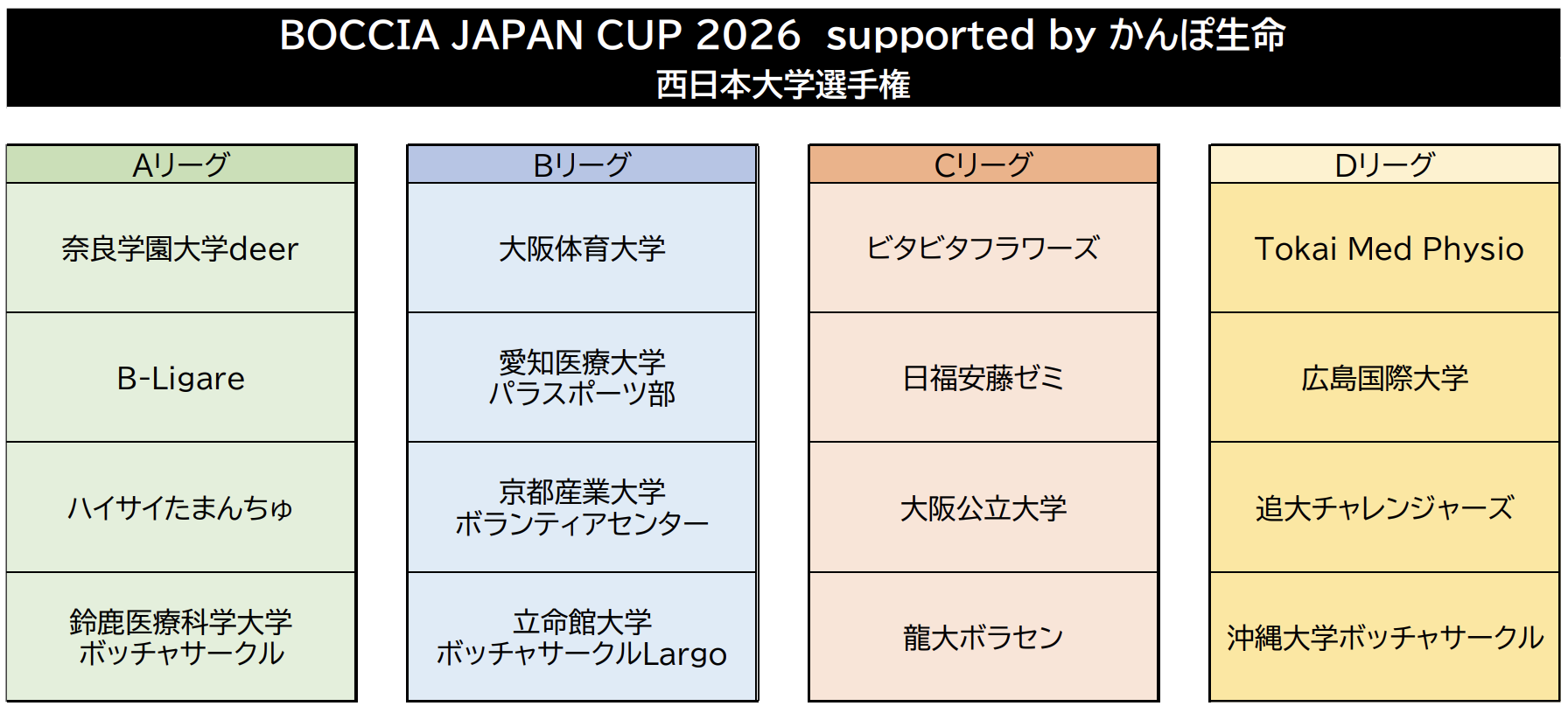 2026年3月7日(土)、8日(日)に行われる「BOCCIA JAPAN CUP 2026 supported by かんぽ生命」の出場権をかけた予選会のエントリーが先週締め切られ、今年も多くのチームにエントリーしていただきました。一般の部では80チーム、東日本大学選手権には15チーム、西日本大学選手権には16チームがエントリー。11月29日(土)には東西での大学選手権、30日(日)には一般予選会が行われます。